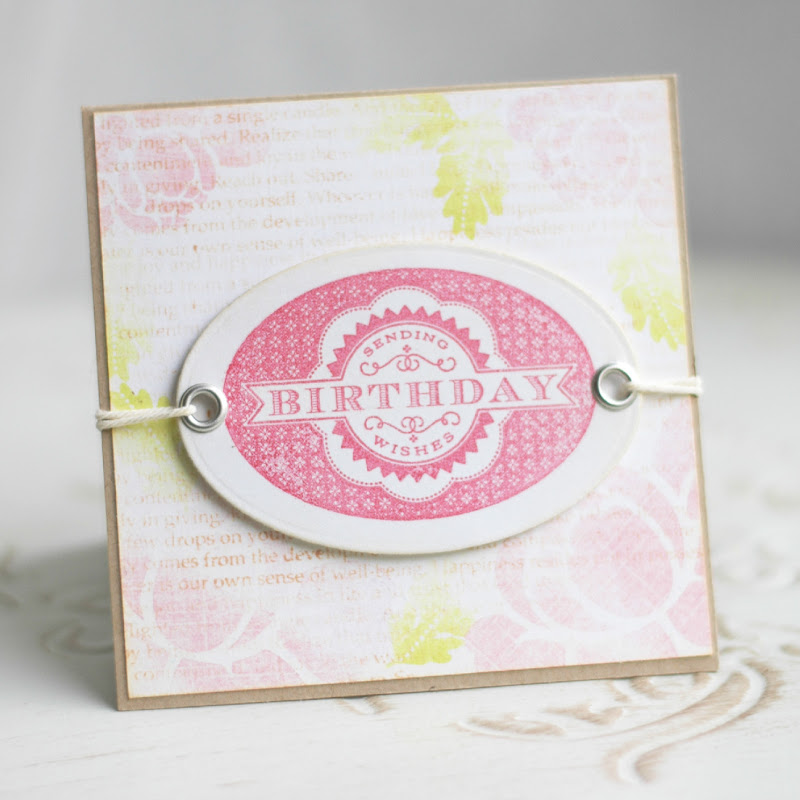 And so I did. The text was first stamped on a scrap of paper before stamping on the card which gives a softer printing. I did the same with the roses. By accident I got structure in the roses. I stamped on a scrap with linen structure and this also appeared onto the stamped images. I added some leaves to give it a fresher look. The birthday tags are pierced with a eyelets and hold in place with twine.